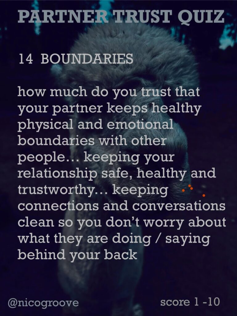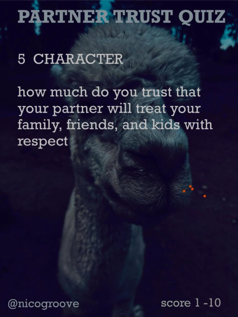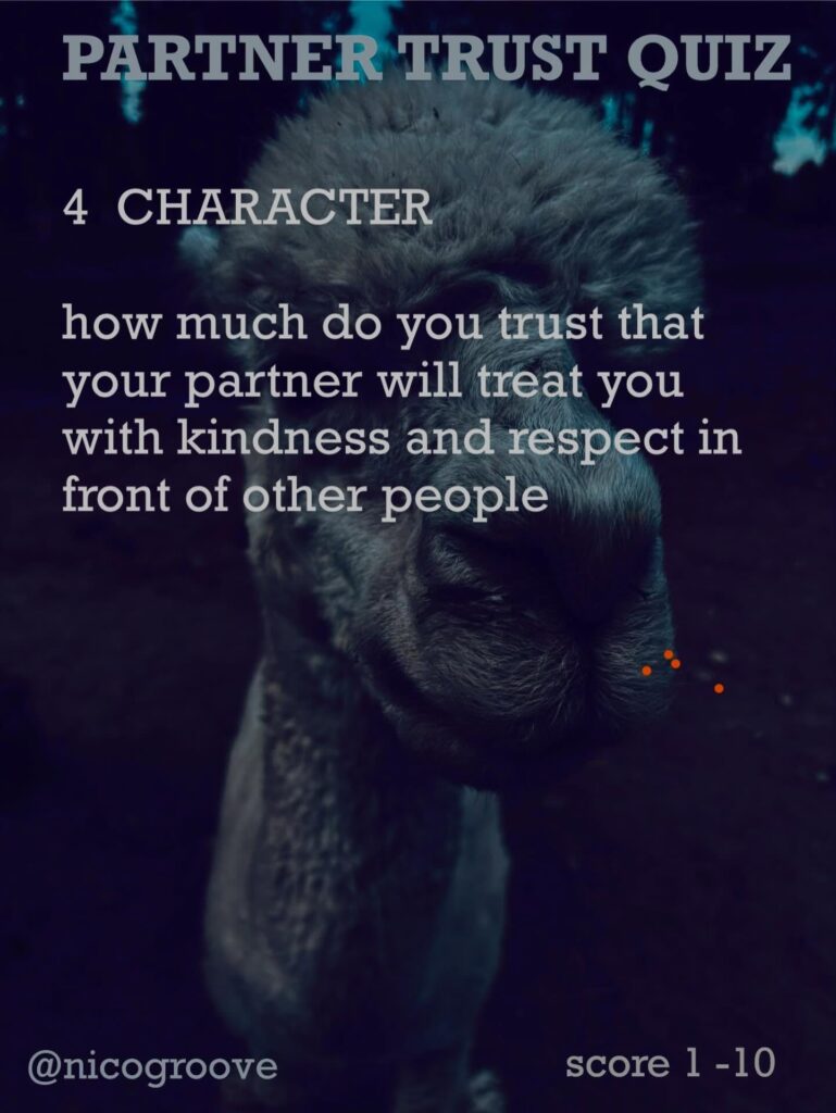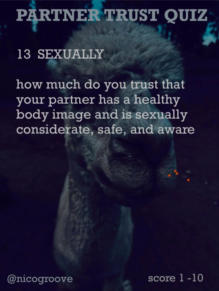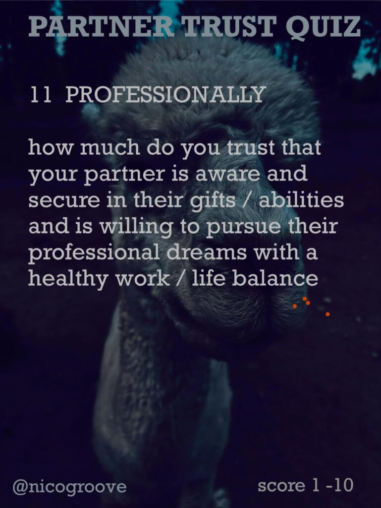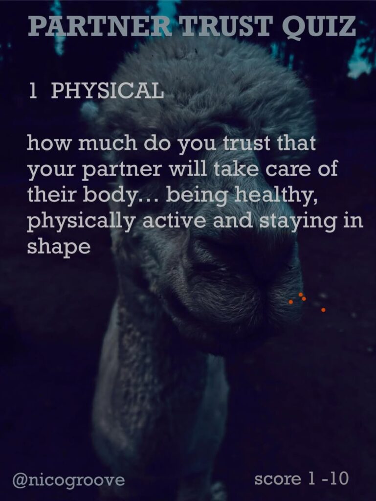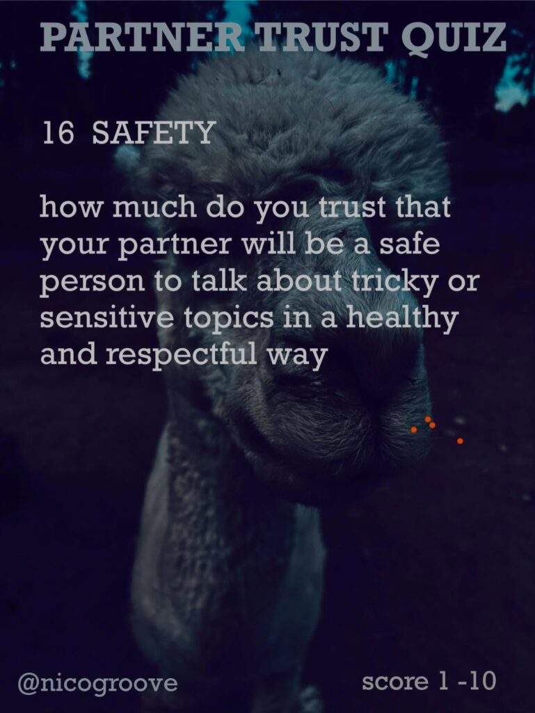 I was chatting with a partner about trust and was thinking, “Trust is tricky because there are so many different ways you can trust someone.” So I came up with “TRUST QUIZ” with 16 different questions to ask yourself (or your partner) to see how much you trust them in these different areas. Rate each question on a scale of 1-10 and see how you score.