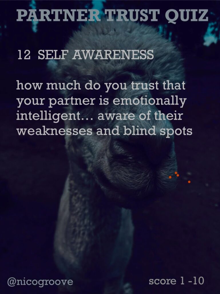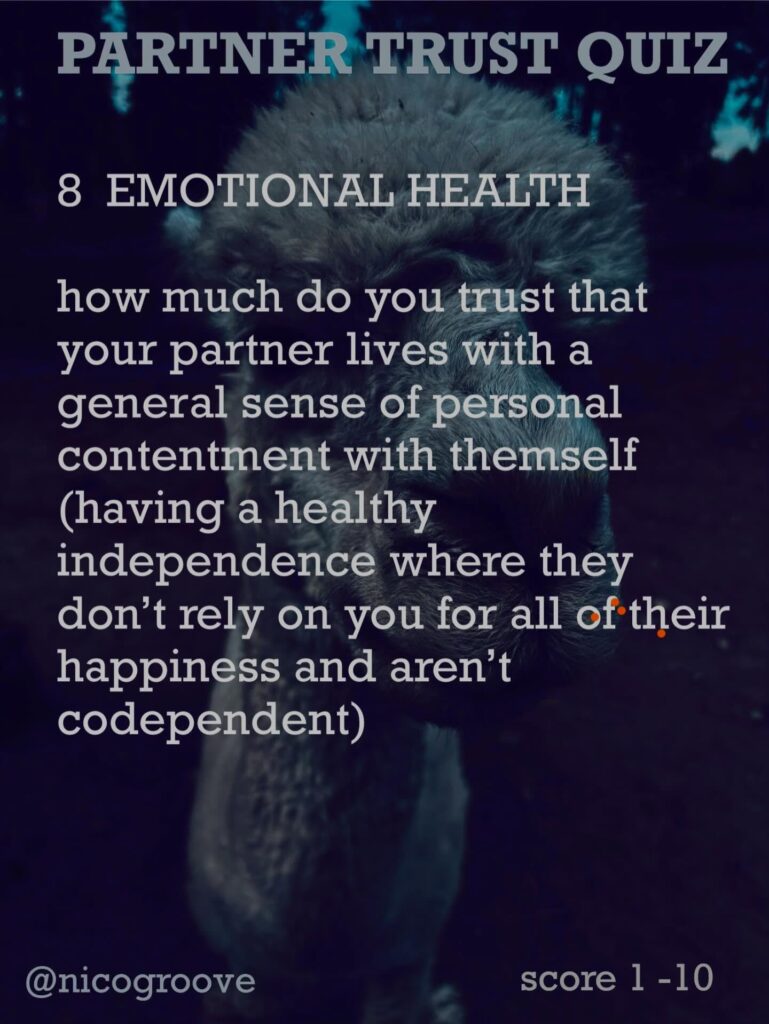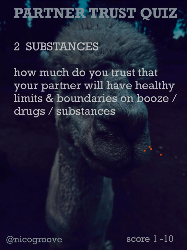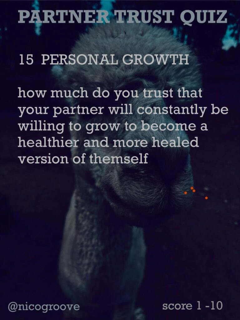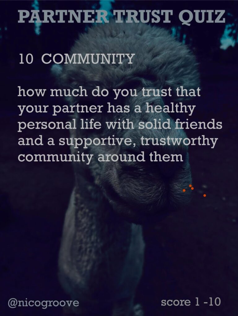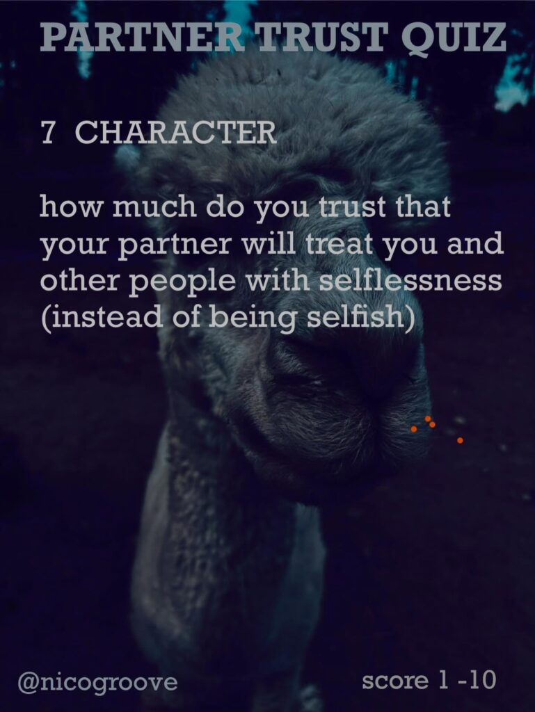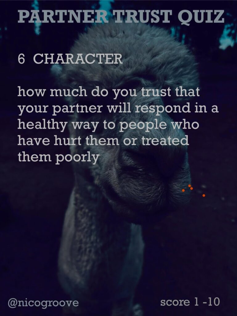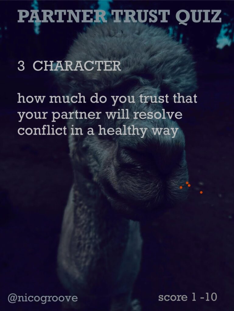 I was chatting with a partner about trust and was thinking, “Trust is tricky because there are so many different ways you can trust someone.” So I came up with “TRUST QUIZ” with 16 different questions to ask yourself (or your partner) to see how much you trust them in these different areas. Rate each question on a scale of 1-10 and see how you score.